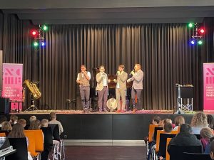 Die vier Hanke Brüder zeigten ihr ganzes musikalisches Können an Violine, Bratsche, Tuba, verschiedenen Flöten und am Klavier. Zu Beginn stellten die talentierten Musiker ihre Instrumente durch ein Quiz vor, bei dem die Kinder ihr Vorwissen einbringen konnten. Beim nun folgenden Konzert begeisterten sie ihr Publikum durch die abwechslungsreichen Musikstücke, unter anderem zum Thema „Die vier Elemente“, und ihre zugewandte Art. Besondere Freude hatten die Schülerinnen und Schüler an den in die Musikstücke eingebetteten Zaubertricks und bei den Mitsing-Aktionen, die niemanden mehr auf seinem Stuhl hielten. Wir bedanken uns herzlich bei den Hanke Brothers für das besondere Konzerterlebnis und beim Förderverein unserer Schule, der das Konzert bezuschusst hat.